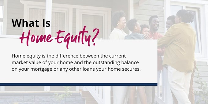 Home equity is the difference between the current market value of your home and the outstanding balance on your mortgage or any other loans your home secures.